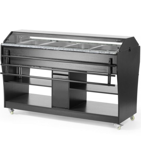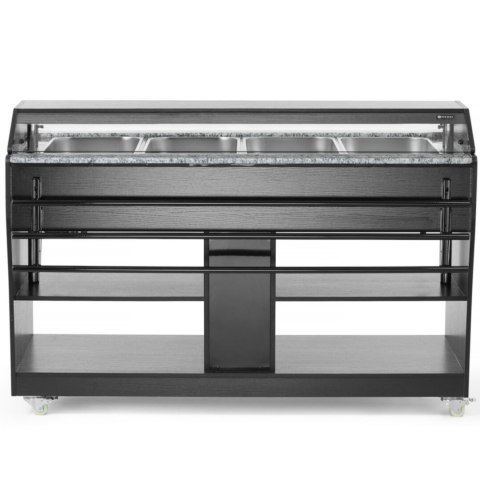 Bufet grzewczy marki Arktic sprawdzi się w restauracjach samoobsługowych czy w cateringu. Wyposażony został w oświetlenia daszku, posiada składane prowadnice na tace po obu stronach. Daszek można opuścić, aby pełnił funkcję osłony. Bufet przeznaczono na 4 pojemniki GN 1/1 o maksymalnej głębokości 150 mm. Z boku znajdują się półki do przechowywania talerzy i sztućców. Obudowa wykonana została ze stali nierdzewnej z czarną drewnianą sklejką. Temperatura jest regulowana w zakresie 30-90deg;C.