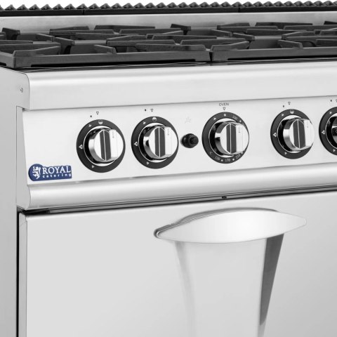 Wolnostojąca kuchenka gazowa marki Royal Catering zapewnia funkcjonalność, trwałość i elegancję w jednym. Dodatkowo zawiera ona piekarnik gazowy i dolną szafkę na przybory kuchenne. Dzięki precyzyjnej kontroli temperatury i funkcjom bezpieczeństwa urządzenie o mocy 27,6 kW niezawodnie sprawdzi się w branży gastronomicznej, w kuchniach hotelowych i restauracyjnych czy akademikach. Pod sześcioma palnikami znajduje się pojemny piekarnik na wszelkiego rodzaju wypieki oraz szafkę na garnki, patelnie i inne przybory kuchenne, które zawsze łatwo przechować z dala od kurzu. Kuchnię gazową zapala się ręcznie. W zestawie znajduje się zapalniczka oraz dwa zestawy dysz do przekształcenia modelu na gaz ziemny lub LPG. Urządzenie jest fabrycznie ustawione na gaz typu I3B/P(50), który idealnie sprawdzi się w wielu kuchniach gastronomicznych. Wszechstronność pozwoli dostosować kuchenkę na gaz do indywidualnych potrzeb i warunków panujących na miejscu. Piekarnik posiada elektryczny zapalnik. Dzięki precyzyjnej kontroli temperatury za pomocą poręcznego pokrętła wybiera się żądaną temperaturę pieczenia w zakresie od 130 do 330deg;C. Termostat i specjalna konstrukcja drzwiczek pieca zapewnią stałe ciepło. Brak silikonowej taśmy uszczelniającej w piekarniku sprawia, że urządzenie jest bardzo odporne na zużycie i nie będzie wymagać intensywnej konserwacji. Nóżki o regulowanej wysokości zapewnią płycie grillowej stabilną pozycję nawet na nierównym podłożu. Blokada płomienia, zaokrąglone krawędzie i zintegrowany okap z osłoną przeciwbryzgową zadbają o bezpieczeństwo podczas użytkowania. Obudowa i drzwi kuchenki gazowej wykonane są z wysokiej jakości stali nierdzewnej. Materiał jest nie tylko wytrzymały, ale także wyjątkowo higieniczny - idealny do codziennego użytku w profesjonalnych kuchniach. Gładkie powierzchnie są odporne na większość zabrudzeń i łatwo je wyczyścić. Można też wyjąć ruszty palników, aby dokładniej umyć płytę kuchenki.