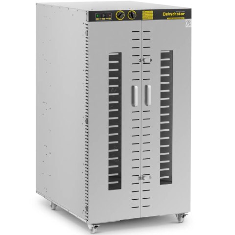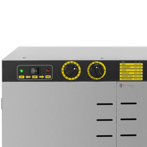 Suszarka do żywności marki Royal Catering pozwala na produkcję zdrowych, suszonych przysmaków w restauracji, barze czy sklepie. Usunięcie wody przez suszenie sprawia, że owoce, warzywa i zioła oraz ryby i mięso zachowują znacznie dłuższą trwałość. W komorze o pojemności 600 litrów znajdują się 24 wyjmowane ruszty ze stali nierdzewnej, które zapewniają wystarczającą ilość miejsca do jednoczesnego suszenia do 90 kg żywności. Dzięki mocy 5850 W element grzejny szybko osiąga żądaną temperaturę w zakresie od 40 do 90deg;C. Utrzymuje ją też na stałym poziomie dzięki systemowi kontroli temperatury. System cyrkulacji gorącego powietrza 360deg; sprawia, że ciepło rozprowadzane jest równomiernie wewnątrz suszarki. Dzięki temu nadaje się ona również do odświeżania żywności. Ustawianie temperatury i timera do 15 godzin jest intuicyjne i przyjazne dla użytkownika za sprawą pokrętła znajdującego się z przodu. Komora, obudowa i wkłady wykonane zostały ze stali nierdzewnej, są łatwe w czyszczeniu i niezwykle trwałe. Front z hartowanego szkła pozwala na podgląd procesu suszenia w dowolnym momencie bez konieczności otwierania drzwi.