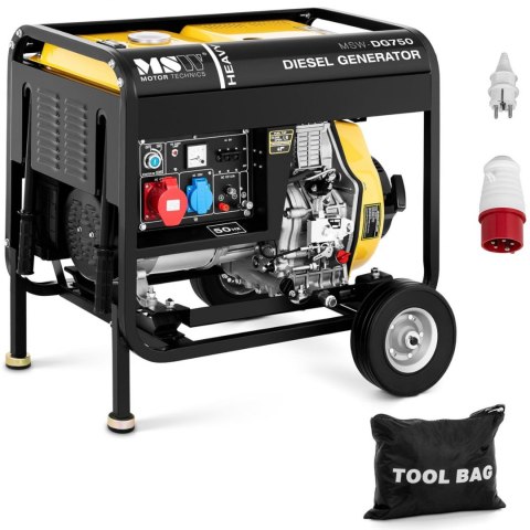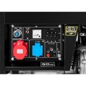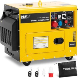 Agregat prądotwórczy diesel marki MSW generuje prąd o napięciu 230/400 V. Przydaje się we wszystkich miejscach bez dostępu do energii elektrycznej, np. na placach budowy, otwartych przestrzeniach itp. Wysoka wydajność to zasługa maks. mocy 4,4 kW. Wyjście znamionowe wynosi 50 Hz, 5,5 kVA. Wyposażono go w zbiornik paliwa o pojemności 12,5 l. Czas pracy ciągłej to 7,5 h (50 Hz). 1-cylindrowy, 4-suwowy silnik diesel HP186FAE ma rozruch elektryczny. Jest chłodzony powietrzem. Jego moc wynosi 5,5 kW (7,5 PS). Agregat prądotwórczy posiada 3 gniazda: 400 V, AC 230 V i DC 12 V. Dzięki nim możesz zasilać kilka różnych maszyn, nawet równolegle. Na wskaźniku w dowolnym momencie odczytasz dane napięcia w czasie rzeczywistym. Generator można włączyć za pomocą elektronicznego rozrusznika (akumulatory są zawarte w dostawie). Bezpieczeństwo obsługi zapewniająstopień ochrony IP23 i ochrona przed przeciążeniem. Duża mobilność to zasługa poręcznych uchwytów i kółek.