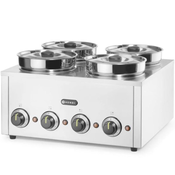 Bemar Thermosystem 4 marki Hendi pozwala utrzymać gorące sosy, zupy i innego rodzaju żywność w żądanej temperaturze bez przypalenia. Temperatura może być regulowana na 6 poziomach w zależności od potrzeb produktu (od ok. 30 do 85deg;C). Lampka kontrolna sygnalizuje grzanie, Obudowa i zbiornik na wodę wykonane zostały ze stali nierdzewnej. Urządzenie posiada niezależny termostat dla każdego elementu grzewczego, który jest regulowany za pomocą pokrętła. Wytrzymała konstrukcja ze stali nierdzewnej wyposażona została w nóżki antypoślizgowe zapewniające jej stabilność. W zestawie znajdują się 4 pojemniki ze stali nierdzewnej o pojemności 4l i wymiarach śr. 215 x 177 mm.