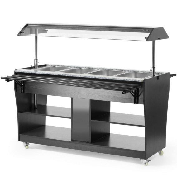 Bufet grzewczy marki Arktic sprawdzi się w restauracjach samoobsługowych czy w cateringu. Wyposażony został w oświetlenia daszku, posiada składane prowadnice na tace po obu stronach. Daszek można opuścić, aby pełnił funkcję osłony. Bufet przeznaczono na 4 pojemniki GN 1/1 o maksymalnej głębokości 150 mm. Z boku znajdują się półki do przechowywania talerzy i sztućców. Obudowa wykonana została ze stali nierdzewnej z czarną drewnianą sklejką. Temperatura jest regulowana w zakresie 30-90deg;C.