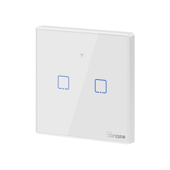 Sonoff T0EU2C-TX jest to dotykowy inteligentny włącznik światła, sterowany bezprzewodowo przez Wi-Fi. Może na raz kontrolować dwa obwody oświetleniowe w domu. Pozwala na indywidualne włączanie i wyłączanie światła oraz ustawianie harmonogramów pracy lamp.