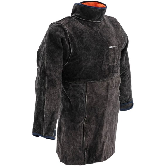 Fartuch spawalniczy marki Stamos Germany niezawodnie chroni przed ciepłem, odpryskami spawalniczymi i iskrami. Wraz z przyłbicą i rękawicami stanowi odpowiednią ochroną spełniającą wymagania zawodowe. Wysokiej jakości skórzany fartuch pozwala ochronić górną część ciała. Wykonany został z dwoiny bydlęcej, jest wytrzymały, znosi intensywne, codzienne użytkowanie. Szwy są wyjątkowo odporne na rozdarcie i rozciąganie oraz na wysoką temperaturę i ogień. Regulowany nylonowy pasek pozwala dopasować fartuch do sylwetki. Bezpieczne i łatwe w użyciu zapięcie na zatrzask ułatwia jego zakładanie i zdejmowanie.