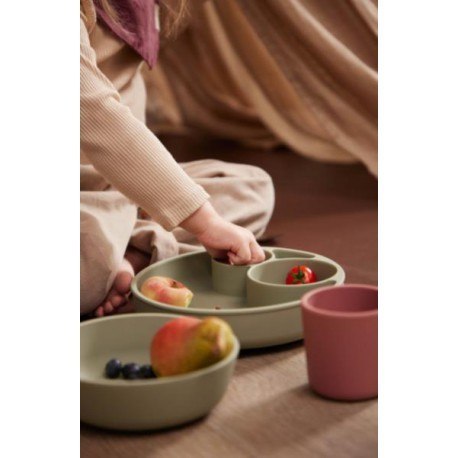 Filibabba Silikonowy talerzyk z przegródkami Green Wszystkie produkty tej duńskiej marki powstają z miłością i najwyższym szacunkiem do ludzi i środowiska. Filozofią firmy jest postępowanie w zgodzie z ideą zrównoważonego rozwoju, odpowiedzialnego i rozsądnego korzystania z zasobów naszej Planety. Dbając o Ziemię i nasze dzieci, producent tych zachwycających artykułów starannie selekcjonuje materiały, z których wytwarza swoje produkty. Wiele z nich odznaczane jest prestiżowym certyfikatem GOTS, przyznawanym jedynie spełniającym rygorystyczne kryteria jakości, na każdym etapie ich powstawania. Produkty marki są inspiracją do marzeń o świecie dla dzieci i dorosłych a skandynawskie kolory i design są wyrazem równowagi i harmonii, ponieważ pragnieniem Filibabba jest aby nasze dzieci dorastały w pięknym i ekscytującym ale przede wszystkim bezpiecznym świecie. Charakterystyka: Od teraz posiłki będą czystą przyjemnością dzięki praktycznemu talerzowi z przegródkami, opracowanemu we współpracy z duńską dietetyczką dziecięcą Signe Severin. Według specjalistki, produkt został zaprojektowany tak, aby zachęcić Twojego malucha do samodzielnego jedzenia pysznego posiłku. Silikonowy talerz podzielony jest na sekcje z jedną dużą komorą i dwiema małymi miseczkami, co sprawia, że talerz jest idealnym wyborem dla rodziców stosujących metodę BLW. Przegródki pomagają również w oddzieleniu od siebie różnych składników, co ceni sobie wiele dzieci. Dzięki mocnej przyssawce pod spodem, talerz trzyma się stabilnie na blacie, nawet jeśli podczas posiłku zrobi się trochę bałaganu. Dzięki stonowanym kolorom i minimalistycznemu wyglądowi, zestaw będzie idealnym wyborem dla rodziny kochającej prosty i funkcjonalny design. Nasz podzielony talerz wykonany został w 100% z silikonu o miękkiej powierzchni, ułatwiającej dziecku samodzielne jedzenie. Silikon jest bardzo trwałym materiałem, który nie pęka i nie łamie się jak plastik. Talerzyk Filibabba odpowiedni jest do piekarnika (max 200°), mikrofali i zamrażarki i można go myć w zmywarce. Instrukcja czyszczenia: Przed użyciem należy umyć produkt ciepłą wodą i neutralnym detergentem. Produkt można myć w zmywarce, w górnym koszu. Cechy produktu: Skład: 100% silikon Wymiary produktu Wysokość (cm) 5,00 Szerokość (cm) 19,00 Długość (cm) 19,00 Waga (gramy) 308,00 FI-02276