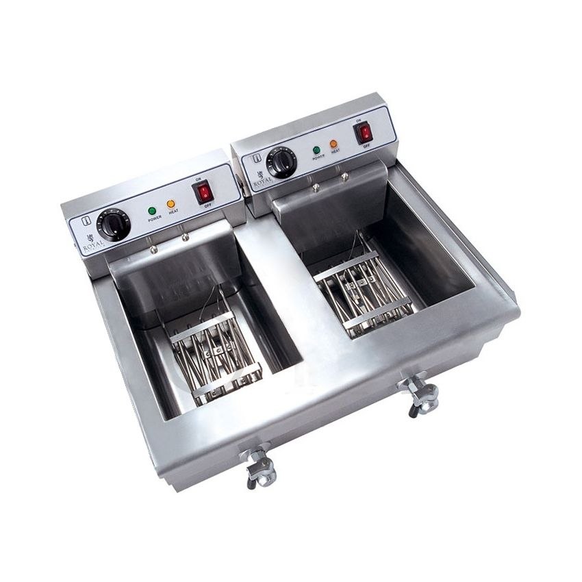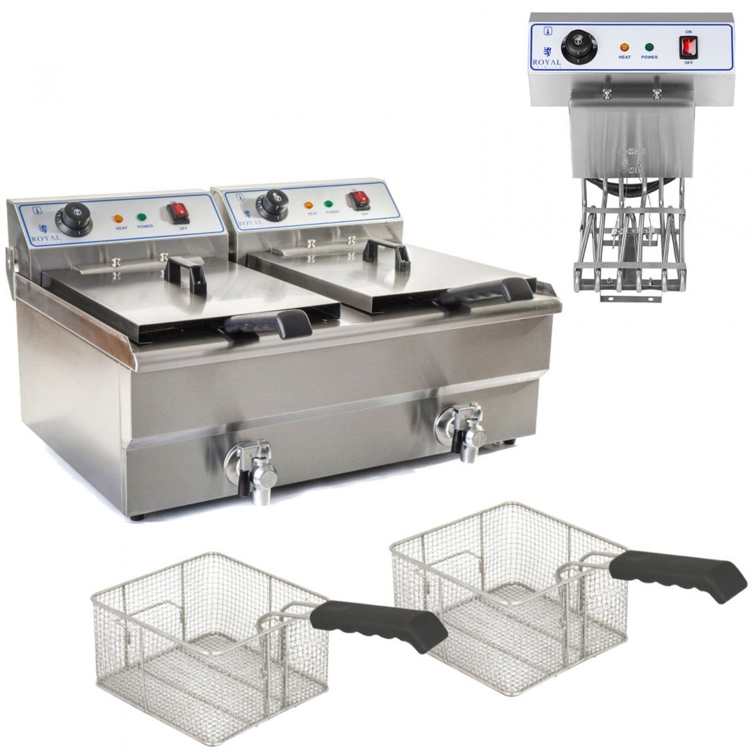 Profesjonalna frytownica nastawna marki Royal Catering sprawdzi się w każdej restauracji, barze szybkiej obsługi, stołówce czy w firmie cateringowej. Urządzenie wyposażono w dwie komory o pojemności 16 l każda (3 kg frytek). Frytownica posiada dużą moc grzewczą 2 x 6000 W. Każda z komór zasilana jest oddzielnie oraz dysponuje osobną grzałką. Przygotowanie porcji frytek (100-150 g) zajmuje zaledwie 2,5-3 min. Termostaty odpowiadają za precyzyjne ustawienie temperatury na określonym poziomie (maks. 200deg;C) oraz wyłączają pobór prądu w przypadku jej przekroczenia. Wyjmowane kosze, elementy grzewcze oraz kraniki odpływowe można swobodnie wyjąć co ułatwia utrzymanie czystości.