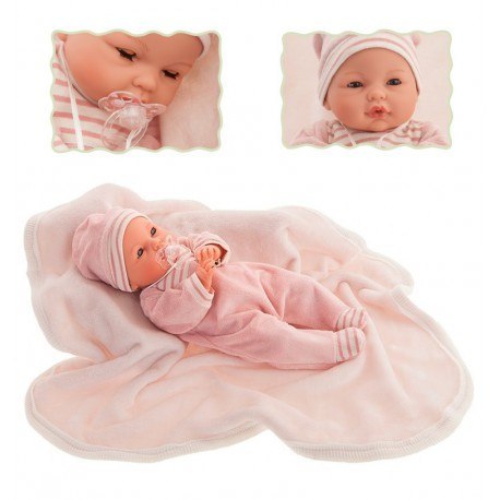 Hiszpańska lalka BIMBA MANTA INFORMACJE O LALCE Lalka jest w 100% wyprodukowana w Hiszpanii przez rodzinną firmę Antonio Juan , która poświęca dużo czasu, by każdy element lalki zrobiony był jak najdokładniej.  Po usunięciu smoczka z buzi laleczka zaczyna płakać i prosić byś włożył go z powrotem. Brzuszek lalki zrobiony jest z miękkiego materiału, w którym umieszczono bezpieczny moduł dźwiękowy. Nóżki, rączki oraz główka lalki wykonane są z przyjemnego w dotyku winylu.  Miękki brzuszek sprawia, że jest idealną lalką do przytulania. Jest też lżejsza od lalek w całości zrobionych z winylu, więc z powodzeniem mogą się bawić nią mniejsze dzieci. Lalka ubrana jest w urocze ubranka i ma ze sobą różowy kocyk, na którym może wygodnie się położyć podczas drzemki.  Jeśli ułożysz lalkę do spania to zamknie oczy jak prawdziwy chłopiec. W KOMPLECIE ZNAJDZIESZ  Lalkę chłopca z miękkim brzuszkiem Ubranka (piżama, czapeczka)  Różowy kocyk Smoczek Oryginalne pudełko  WYMIARY LALKI  Wzrost: 37 cm  Zabawka przeznaczona jest dla dzieci powyżej 3 roku życia.  Posiada certyfikat CE.  Lalkę należy czyścić wilgotną szmatką, nie należy jej kąpać.  14155