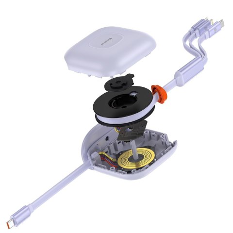 Prezentowany gadżet Baseus to prosta, lecz trwała konstrukcja. W środkowej części przewodu znajduje się szpula z logo producenta wykonana w ciekawym stylu. W niej znajduje się zwinięty kabel, który w razie konieczności naładowania sprzętu można w prosty sposób rozwinąć i wpiąć do ładowarki. Z drugiej strony znajduje się rozgałęzienie z trzema dodatkowymi wejściami. Kabel wpinany do zasilania został pokryty materiałem ochronnym, co wpływa na jego odporność przed przetarciem się czy zagięciem. Poza tym cała konstrukcja może zostać postawiona na stopce dzięki czemu gadżet może być wszechstronnym organizerem.