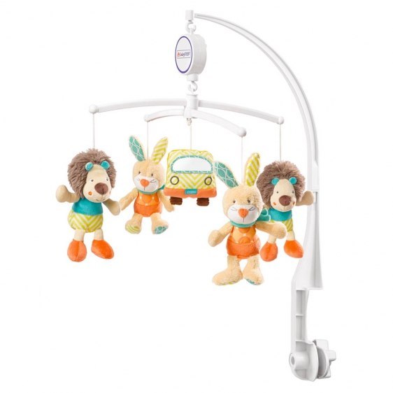 Karuzela, zabawka z pozytywką z kolekcji: Zabawni przyjaciele. Dwa zabawne, wielobarwne lewki i urocze, hip-hopowe króliczki wyruszają swoim wspaniałym busikiem w podróż do świata przygód i zabiorą Twojego maluszka do krainy snów. Mechaniczna pozytywka z włącznikiem/wyłącznikiem/ pozwala postaciom tańczyć i łagodnie uspokajać w rytmie popularnej kołysanki.W ciągu dnia tańczące postacie budzą ciekawość i zapraszają do słuchania, oglądania i podziwiania. Delikatne kolory i różnorodne powierzchnie stymulują percepcję dziecka. Figurki łatwo można usunąć podczas mycia. Uchwyt karuzeli umożliwia łatwe mocowanie. W ten sposób karuzela z pozytywką szybko staje się niezbędna na łóżeczku Twojego maluszka. Karuzela wyposażona jest w miłe w dotyku, łatwo odpinane zabawki, lusterko i pozytywkę. Wzbudza ciekawość i stymuluje percepcję dziecka. Delikatne dźwięki pozytywki wyciszają i usypiają maluszka. Ręcznie nakręcana pozytywka nie wymaga stosowania baterii. Łatwa w montażu. Można prać. Rozmiar : 40 cm. Wszystkie zabawki niemieckiej marki FEHN są bezpieczne dla dzieci od 0 lat. wykonane są z najlepszej jakości materiałów. spełniają normy EN71, CE, badane w instytutach ""Stiftung Warentest"" lub ""Ökotest". 66166