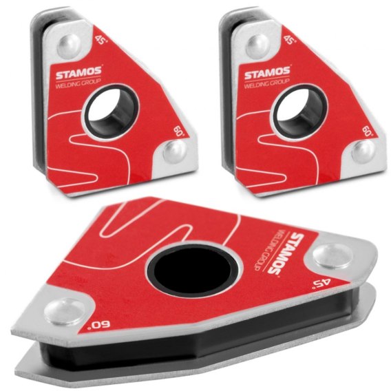 Kątownik spawalniczy marki Stamos sprawdzi się podczas spawania, lutowania czy innych prac montażowych. Konstrukcja urządzenia w kształcie strzałki umożliwia używanie go w różnych pozycjach. Magnesy ustawić można pod kątami 30/45; 60/90°. Silne połączenie magnetyczne do 15 kg umożliwia szybkie i dokładne łączenie różnych elementów metalowych ze sobą. Praktyczny otwór w środku magnesów ułatwia ich obsługę. Wgłębienia umożliwiają używanie równoległe obu magnesów, co zwiększa siłę przyciągania. Urządzenie posiada trwałą stalową obudowę.