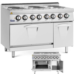 Kuchenka elektryczna marki Royal Catering sprawdzi się w profesjonalnej kuchni. Jej rozmiar wynosi 120 x 70 x 90 cm i posiada aż 6 płyt grzewczych, każda o mocy 2600 W i średnicy 22 cm. Regulacja mocy odbywa się za pomocą dużych pokręteł. Kuchenka posiada wbudowany piekarnik konwekcyjny z półkami na maksymalnie 4 blachy i mocą 3000 W. Urządzenie jest wolnostojące, jego podstawa zapewnia dużo miejsca do przechowywania przyborów kuchennych. Kuchenkę wykonano z wysokiej jakości materiałów, stal nierdzewna do obudowy i żeliwo do płyt grzewczych są łatwe w utrzymaniu czystości i wyjątkowo trwałe.
