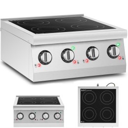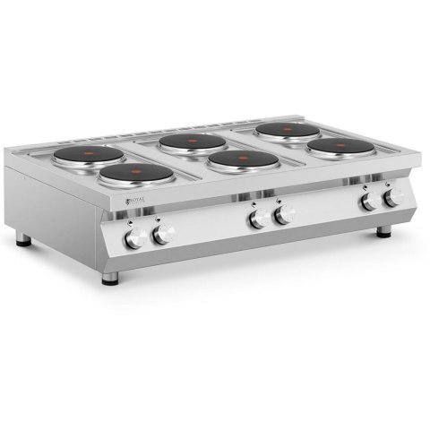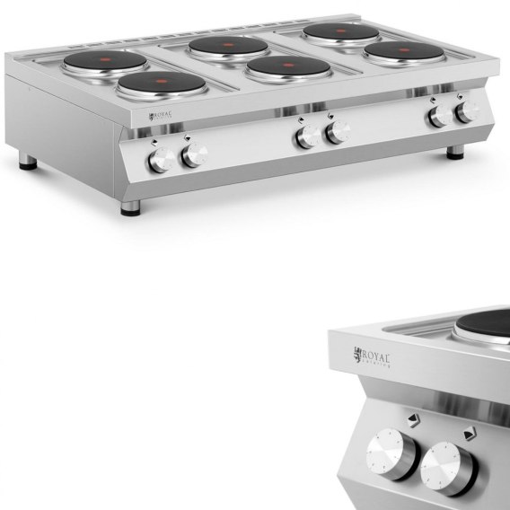 Kuchenkę elektryczną marki Royal Catering wyprodukowaną we Włoszech, stworzono z myślą o intensywnej pracy w punktach gastronomicznych, dlatego zadbano o świetną wydajność, perfekcyjną wytrzymałość i łatwość w czyszczeniu. Doskonała wydajność urządzenia to zasługa dużej mocy całkowitej na poziomie 15600 W. Oznacza to, że każdy z 6 palników ma moc 2600 W. Do kontrolowania siły grzania służą 6 pokręteł umieszczone z przodu kuchenki elektrycznej. Obudowę urządzenia wykonano ze stali nierdzewnej. Za stabilność odpowiadają 4 nóżki, ponadto bez problemu wyczyścisz powierzchnię roboczą pod urządzeniem.