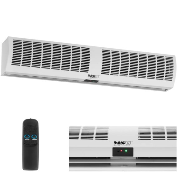 Kurtyna powietrzna marki MSW stworzy barierę zimnego powietrza przy wejściach do sklepów, biur czy innych pomieszczeń. Pionowy przepływ zapobiegnie wychłodzeniu się w nagrzanych pomieszczeniach wewnętrznych przez niskie temperatury z zewnątrz. Latem kurtyna powietrza niezawodnie utrzyma chłód z klimatyzacji w pomieszczeniu, z dala od ciepłego powietrza z otoczenia. Kurtynę powietrzną mocuje się na wysokości do 3,5 m za pomocą czterech dostarczonych śrub montażowych. Można ją zainstalować na suficie, albo na ścianie. Urządzenie o mocy 95 W wydmucha powietrze z prędkością do 11 m/s, uniemożliwiając wymianę ciepła. Przepływ powietrza utrzyma też z dala kurz i owady. Sterowanie odbywa się za pomocą przycisków bezpośrednio na urządzeniu lub za pomocą pilota zdalnego sterowania. Model wygeneruje do 56 dB, dzięki czemu nie trzeba martwić się o szumy. Dzięki solidnej konstrukcji elektryczna kurtyna powietrzna nada się również do pracy ciągłej. Obudowa wykonana jest ze stali malowanej proszkowo. Powłoka ochroni urządzenie przed rdzą i zapewni mu estetyczny wygląd. Listwy wykonano z żaroodpornego tworzywa ABS. Dzięki temu model jest trwały, łatwy w utrzymaniu i niezawodny.