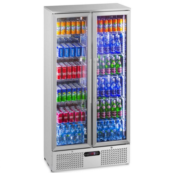 Lodówka na napoje Royal Catering idealny sprzęt do przechowywania napojów w chłodnej temperaturze oraz ich eksponowania (dzięki światłu LED). Model RCGK-458S sprawdzi się szczególnie dobrze w gorące dni, kiedy Twoi klienci będą mogli zobaczyć atrakcyjnie pokazaną ofertę soków, wody mineralnej, piwa itd. Możliwość eksploatacji w wielu miejscach to zaleta chłodziarki na napoje. Urządzenie Royal Catering zda egzamin w restauracjach, kawiarniach, barach z szybkim jedzeniem, lokalach z przekąskami, bistrach, sklepach, kioskach oraz na stoiskach gastronomicznych podczas imprez plenerowych.