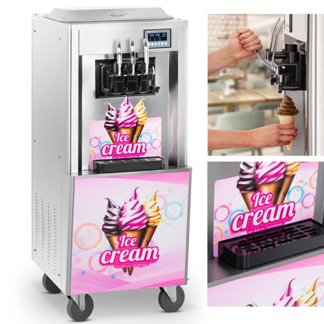 Urządzenie posiada dwa pojemniki po 8,5 l każdy i jest w stanie przygotować 23 l lodów o trzech smakach w ciągu godziny. Wydajność maszyny to zasługa silnika przemysłowej klasy który szybko miesza masę lodową. Produkt końcowy jest gotowy po zaledwie 15 minutach. W urządzeniu zastosowano system kontroli konsystencji, który sprawia że lody zawsze będą kremowe i bardzo smaczne. Intuicyjny panel sterowania z cyfrowym wyświetlaczem umożliwia szybkie i bezproblemowe odczytanie i ustawienie niezbędnych parametrów. Konstrukcję wykonano ze stali nierdzewnej odpornej na korozję, trwałe zabrudzenia, uszkodzenia mechaniczne oraz nie wchodzącą w reakcje z żywnością. W zestawie znajduje się tacka ociekowa oraz pokrywa zapewniająca zachowanie odpowiedniej temperatury. Mobilność maszyny zapewniają 4 kółka z dwoma hamulcami umożliwiającymi zablokowanie kół.