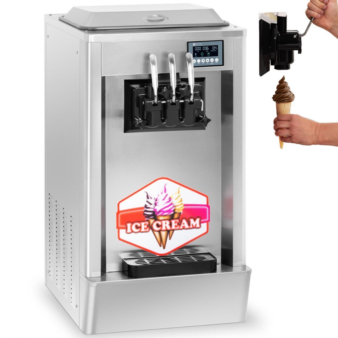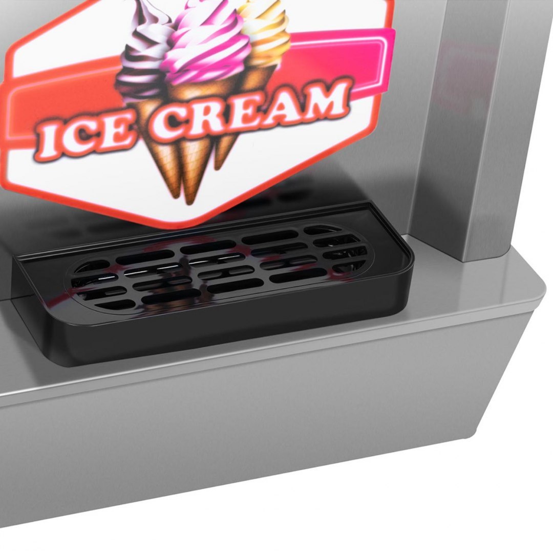 Urządzenie posiada dwa pojemniki po 8,5 l każdy i jest w stanie przygotować 20 l lodów o trzech smakach w ciągu godziny. Wydajność maszyny to zasługa silnika przemysłowej klasy który szybko miesza masę lodową. Produkt końcowy jest gotowy po zaledwie 15 minutach. W urządzeniu zastosowano system kontroli konsystencji, który sprawia że lody zawsze będą kremowe i bardzo smaczne. Intuicyjny panel sterowania z cyfrowym wyświetlaczem umożliwia szybkie i bezproblemowe odczytanie i ustawienie niezbędnych parametrów. Konstrukcję wykonano ze stali nierdzewnej odpornej na korozję, trwałe zabrudzenia, uszkodzenia mechaniczne oraz nie wchodzącą w reakcje z żywnością. W zestawie znajduje się tacka ociekowa oraz pokrywa zapewniająca zachowanie odpowiedniej temperatury.