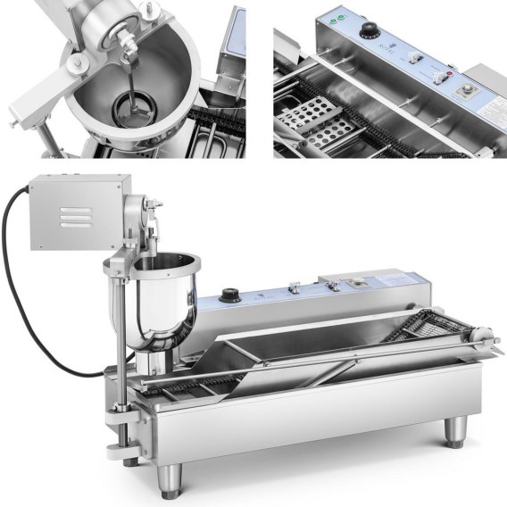 Urządzenie przystosowano do porcjowania, formowania, smażenia i obracania dużej liczby wypieków typu donut. Cały proces jest w pełni zautomatyzowany. Maszyna ma wysoką wydajność, do 900 pączków w ciągu jednej godziny. Do wyboru są trzy rozmiary: mały (śr. 4-5cm), średni (6-7cm), duży (8-9cm). 23-litrowy zbiornik na olej gwarantuje równomierne smażenie a kranik ułatwia zlewanie tłuszczu. Odpowiednia ilość uformowanego ciasta opada z dozownika na rozgrzany olej. Taśma przesuwa pączki a specjalny mechanizm obraca je na drugą stronę. Gotowe wypieki przerzucane są na podstawioną tackę (brak w zestawie). Maszyna formuje w tym samym czasie maksymalnie dwa pączki. Najważniejsze elementy maszyny wykonano ze stali nierdzewnej. Urządzenie posiada zabezpieczenie przed przegrzaniem. Regulowane nóżki zapewniają stabilność.