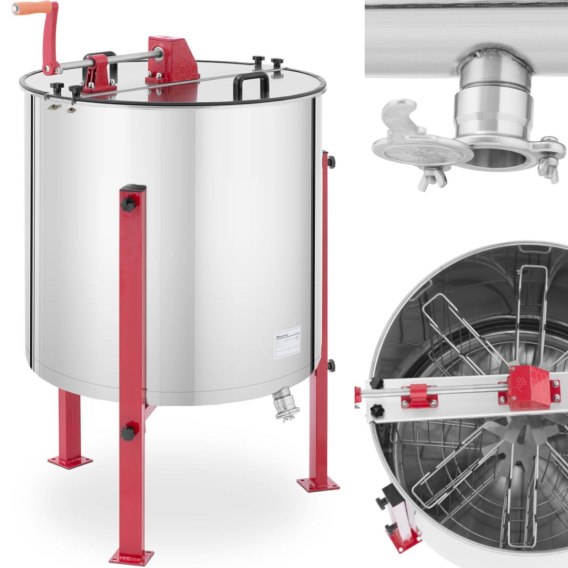 Miodarka marki Wiesenfield sprawdzi się idealnie do produkcji miodu na małą lub prywatną skalę. Miodarka umożliwia łatwe spływanie miodu, a także wyciąganie większych plastrów. Dzięki pojemności 8 ramek o maksymalnym rozmiarze 500 x 245 mm można przetworzyć zbiory w zaledwie kilku cyklach wirowania. Duża średnica zbiornika 68 cm wytwarza wystarczającą siłę odśrodkową do wydajnego wydobywania miodu z plastra. Miodarka jest obsługiwana ręcznie za pomocą żelaznej korby. Za jej pomocą reguluje się prędkość ekstraktora do miodu. Korpus wirówki do miodu i kosz o strukturze plastra miodu wykonano z wysokiej jakości stali nierdzewnej. Dlatego spełnia wymagania higienicznej produkcji miodu. Materiał jest również wyjątkowo trwały i łatwy do czyszczenia po użyciu. Miodarka ze stali nierdzewnej stoi na trzech solidnych żelaznych nogach, co ułatwia napełnianie. Kurek spustowy umożliwia czyste i całkowite opróżnienie wirówki.