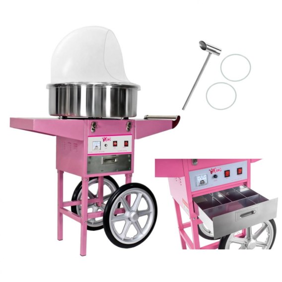 Urządzenie zostało wykonane ze stali szlachetnej, która zapewnia biologiczną neutralność, trwałość i odporność na obicia oraz porysowania. Jest także łatwa w czyszczeniu, elementy wykonane ze stali nierdzewnej nadają się do mycia w zmywarce. Misa o średnicy 52 cm (rozmiar L) umożliwia zrobienie przekąski w różnych wielkościach. Dużą wydajność sprzętu zapewnia element grzewczy o mocy 1200 W. Umożliwia on przygotowanie jednej porcji waty z 12-18 g cukru w bardzo krótkim przedziale czasowym (30 do 60 sekund). Urządzenie wyposażono w dwa przyciski - jedne włącza grzanie, drugi obroty głowicy. Przezroczysta pokrywa z plastiku pozwala obserwować proces powstawania waty cukrowej oraz zabezpiecza przed wiatrem, zabrudzeniami czy czynnikami zewnętrznymi. Mobilność sprzętu to zasługa wózka z dwoma dużymi gumowymi kołami. Sprawdzą się one nawet na wyboistej drodze. Stabilne nóżki zapewniają stabilność. Obszerna szuflada podzielona została na trzy komory umożliwiające przechowywanie akcesoriów.