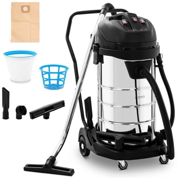Odkurzacz przemysłowy czyszczący na mokro i sucho przeznaczony do profesjonalnego użytku. Urządzenie może być stosowane do różnych powierzchni w przemyśle, budownictwie, stolarstwie, magazynach, warsztatach samochodowych lub biurach. Duża moc 3 silników (do wyboru 1200, 2400 i 3600 W) oraz wysokie podciśnienie ≤22,5 kPa pozwalają uzyskać doskonałe efekty. Komfort użytkowania osiągnięto za sprawą dużej pojemność zbiornika (do 100 l), który umożliwia wielokrotne czyszczenie dużej powierzchni bez konieczności jego opróżniania. Trwała konstrukcja i obudowa zbiornika ze stali nierdzewnej zapewniają długą żywotność maszyny. Łatwy do przemieszczania dzięki wyposażeniu w 4 skrętne kółka oraz uchwytowi w górnej części. Odkurzacz przemysłowy wyposażono w długi przewód zasilający - 7 m. Można odkurzać pył gipsowy, trociny, kurz, piasek, wodę, błoto, płyny, które nie wchodzą w reakcje z elementami urządzenia itp. Zebrane płyny usuniesz za pomocą węża odprowadzającego znajdującego się u dołu. Podwójny system filtracji polega na tym, że wyjmowany filtr HEPA zatrzymuje cząsteczki kurzu oraz pyłu i pomaga znacznie zmniejszyć ich emisję z urządzenia, a biały perforowany filtr bawełniany zapobiega przedostawaniu się ich do silnika (chroni przed uszkodzeniami mechanicznymi).