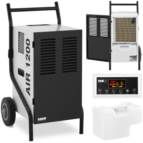 Osuszacz powietrza marki MSW skutecznie usuwa wilgoć w budynkach. Urządzenie przyspiesza prace budowlane takie jak tynkowanie i malowanie, a także pozwala osuszać pomieszczenia po zalaniu oraz zwalczać pleśń. Nadaje się do wnętrz o metrażu 80 m2. Wydajność sprzętu wynosi 50 l na dobę, a moc 860 W. Zapewnia cyrkulację powietrza 630 m3/h. Sprzęt posiada dodatkowe opcje: automatyczne odmrażanie i automatyczny restart. Sygnalizuje również ewentualne uszkodzenie czujnika. Osuszacz powietrza wyposażono w nylonowy filtr, który można prać. Wysoka mobilność wynika z zastosowania dwóch kółek i ergonomicznej rączki. Urządzenie jest proste w obsłudze dzięki wyświetlaczowi LED.
