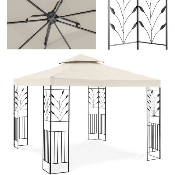 Namiot ma wymiary 3 x 3 x 2,6 m dzięki czemu pomieści wiele osób. Zadaszenie z poliestru o gramaturze 180g/m2 nie przepuszcza szkodliwego promieniowania UV, jest wodoodporne, chroni przed słońcem w upalny dzień oraz deszczem podczas niepogody. Atrakcyjny wygląd altany to zasługa roślinnego ornamentu. Konstrukcję wykonano z żelaza malowanego proszkowo, trwałego i odpornego na korozję. Stabilny szkielet jest bezpieczny, nie wymaga mocowania do podłoża.