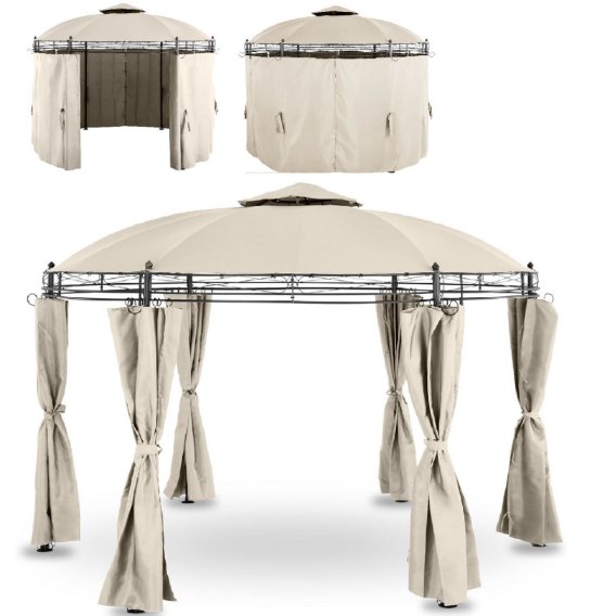 - - Stylowa, okrągła altana z kremowym zadaszeniem oraz zasłonami,