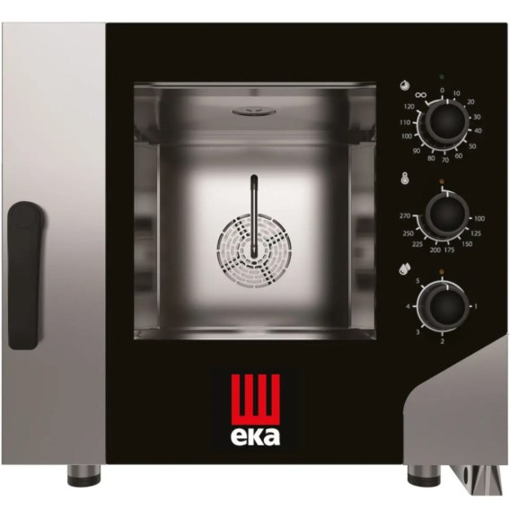 Piec konwekcyjno-parowy Millennial Smart Gastro marki Tecnoeka to nowoczesne urządzenie kuchenne z mniejszą komorą pieczenia, szczególnie polecane dla profesjonalnej gastronomii. Piec umożliwia przygotowanie posiłków w suchym, gorącym powietrzu lub z wykorzystaniem funkcji zaparowania. Piec posiada prowadnice na 5 pojemników GN 1/1 (brak w zestawie). Obudowę wykonano w całości ze stali nierdzewnej. Funkcja zaparowania posiada 5 stopniowa regulację. Urządzenie wyposażono w skuteczną izolację, co pozwala na oszczędność energii elektrycznej. Czas regulowany jest w zakresie 10-120 min lub praca non stop. Zewnętrzna szyba pieca jest chłodzona grawitacyjnie. Piec sterowany jest elektromechanicznie za pomocą 3 pokręteł. Temperatura regulowana jest w zakresie 100-270deg;C. Piec posiada funkcję bezpieczne drzwi - blokada otwarcia przy 60deg;, 90deg;, 120deg; i 180deg; zapobiegająca oparzeniom spowodowanym przez ruch drzwi. Podwójnie przeszklone drzwi do komory oraz oświetlenie LED ułatwiają kontrole procesów w piecu. Drzwi posiadają zawias po prawej stronie. Wygodne otwieranie wewnętrznej szyby drzwi ułatwia jej czyszczenie. Uszczelka drzwi została wykonana z grubego i odpornego silikonu, jest łatwa do samodzielnej wymiany. Rynienka pod drzwiami zapobiega kapaniu skondensowanej pary. Tłoczona komora pieca ma zaokrąglone narożniki, które ułatwiają czyszczenie. Współczynnik szczelności wynosi IPX4. Regulowane nóżki umożliwiają idealne wypoziomowanie. Wymagane jest podłączenie do prądu, wody uzdatnionej, kanalizacji.