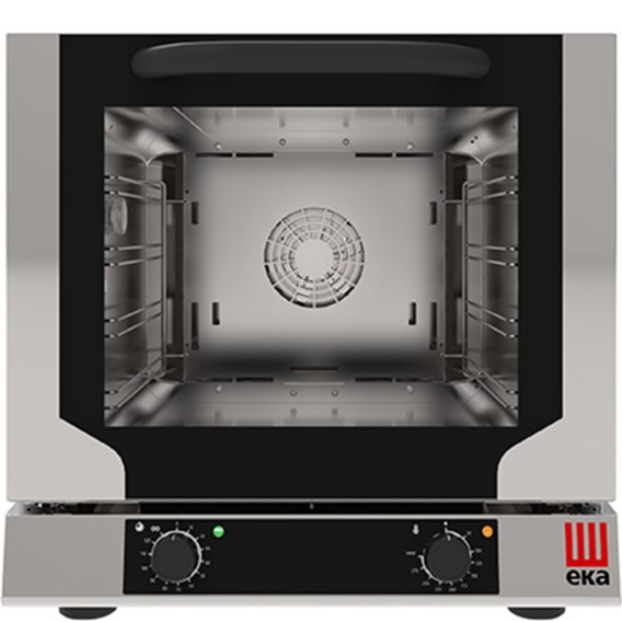 Piec konwekcyjny marki Eka z kolekcji Evolution Next sterowany jest elektromechanicznie. Idealnie sprawdzi się w małych lokalach gastronomicznych typu fast-food, niewielkich piekarni i sklepów, gdzie przygotowuje się zapiekanki, tarty, pieczone warzywa, pieczywo i inne. Zarówno obudowa, jak i komora pieca wykonane są ze stali nierdzewnej AISI 304. Piec posiada dwuwarstwowe przeszklone drzwi, które otwierają się od góry. Komora mieści 4 blachy o wymiarach 429x345x9 mm. Blachy wykonane są z aluminium i dołączone są do zestawu. Odległość między prowadnicami wynosi 74 mm. Piec nagrzewa się w zakresie temperatur od 100deg;C do 260deg;C i ma 1 wentylator bez autorewersu. Nie ma opcji nawilżania. Urządzenie posiada zabezpieczenie przed przegrzaniem i chłodzenie elementów sterujących. Komora wyposażona jest w oświetlenie LED.