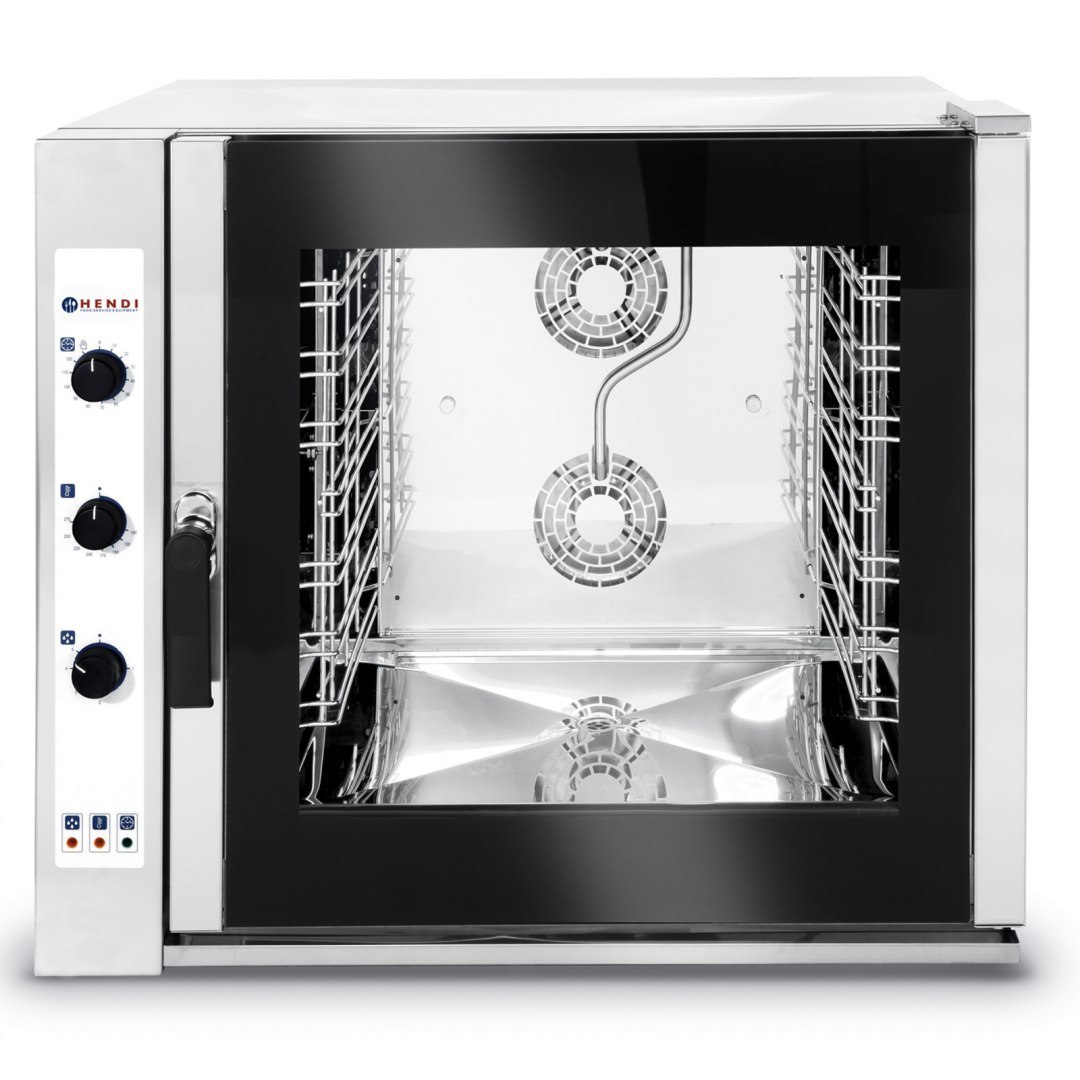 Profesjonalny gastronomiczny elektryczny piec konwekcyjny z zaparowaniem marki Hendi elektryczny, wyposażony sterowanie manualne idealny jest dla małych punktów gastronomicznych wymagających wszechstronnego pieca.