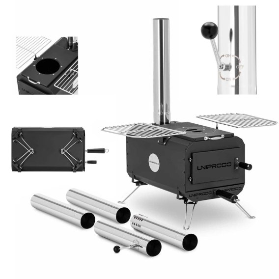 Piec namiotowy marki Uniprodo zapewnia ciepło i wprowadza przyjemną atmosferę w ogrodzie czy na kempingu. Piec posiada płaską powierzchnię, która umożliwia wygodne gotowanie na świeżym powietrzu. Opalany jest drewnem. Jego kompaktowa konstrukcja, odłączane części i składane nogi ułatwiają transport i przechowywanie. W komplecie znajduje się 5 rur kominowych do niezawodnego odprowadzania dymu. Piec posiada także osłonę przed iskrami oraz klapę do regulacji palenia. Wykonany został z wytrzymałej stali węglowej, jest odporny na korozję i bardzo dobrze przewodzi ciepło. Uszczelka zapewnia ciepło bez dymienia. Grubość materiału wynosi 1,2 m a komina 0,4 mm.