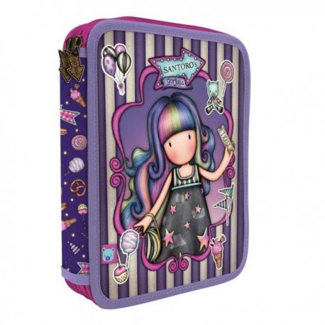 Podwójny Piórnik z Wyposażeniem - Gorjuss - Up and Away Fantastyczna seria Up and Away ozdobiona jest grafiką dziewczynki Gorjuss, utrzymana w kolorach głębokiego fioletu. Na odwrocie fajerwerki, kolorowe girlandy, cukrowa wata - wszystko co znajdziemy w wesołym lunaparku. Podwójny piórnik z wyposażeniem zawierający wszystko to, co potrzebne do szkoły. Pierwsza komora zawiera 2 ołówki HB, komplet 3 długopisów/ czerwony, niebieski, czarny / i 18 kredek, gumkę, oraz temperówkę. Druga komora wyposażona została w komplet 18 flamastrów, linijkę, ekierkę i kątomierz. Każdy element wyposażenia posiada logo Santoro. Wykonany ze szczególną dbałością. Wewnątrz posiada ciekawy wzór. Wspaniały na prezent. Wymiary: 23,5 cm x 19 cm x 4cm. Zabawna kolekcja Fairground pełna plecaków, akcesoriów i artykułów papierniczych, która nawiązuje do tajemniczych przygód przeżytych w Wesołym Miasteczku. Nie brak tu fajerwerków, karuzel, beczek śmiechu, huśtawek i zdobywanych nagród. Zabawne pompony, słodkie wzory, czy metalowe zawieszki przeniosą nas do barwnego świata Santoro, pełnego niespodzianek. To kolekcja, którą będziemy cenić przez wiele lat. Podążaj za dziewczynami, bohaterkami 4 serii: Up & Away, Fireworks, Carusel i First Prize i odkrywaj ekscytującą kolekcję pełną cudownych smakołyków! 688GJ24