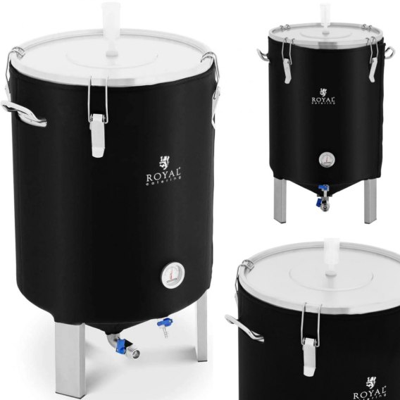 Pojemnik fermentacyjny marki Royal Catering sprawdzi się do dojrzewania piwa czy wina. Stożkowy zbiornik o pojemności 60 l pozwala na oddzielenie osadów od klarownej cieczy. Podwójny system zlewania zapewnia łatwe usuwanie płynów i zanieczyszczeń. Osady takie, jak nadmiar drożdży usuwa się przez dolny kran, a ciecz przez zawór boczny. Wbudowany termometr pozwala monitorować temperaturę fermentacji w zakresie 0-40deg;C lub 0-104deg;F. Płaszcz izolacyjny zapewnia utrzymanie prawidłowej temperatury fermentacji. Otwór w porywie umożliwia niezbędne wyrównanie ciśnienia za pomocą rurki fermentacyjnej bez konieczności otwierania naczynia. Urządzenie zostało wykonane ze stali nierdzewnej. Trzy nóżki z nakładkami chronią powierzchnię przed zarysowaniem i zapewniają stabilność. Zatrzaski mocują hermetycznie pokrywę a boczne uchwyty umożliwiają wygodny transport.