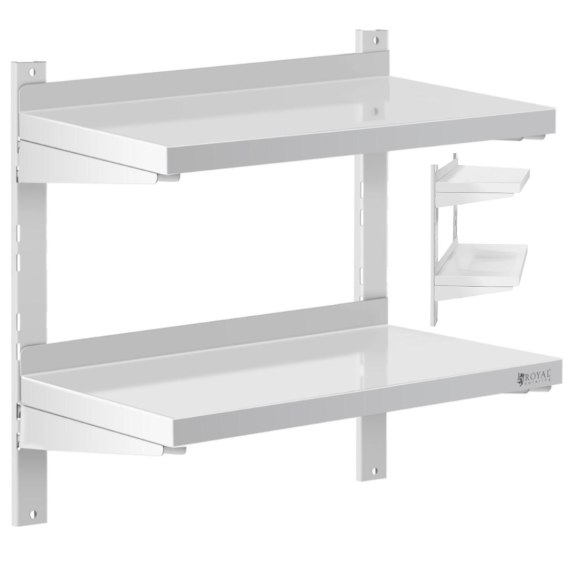 Półka wisząca nierdzewna Royal Catering idealnie sprawdzi się w twojej kuchni, za sprawą pojemnych blatów o długości 60 cm i głębokości 30 cm, pomieści dużą liczbę przypraw, składników, małych sprzętów kuchennych czy środków czystości. Otwarta konstrukcja umożliwia łatwe użytkowanie (zdejmowanie, odkładanie). Montaż ścienny ułatwia ekonomiczne zagospodarowanie każdego wnętrza. Półka została wyposażona w 2 wytrzymałe blaty o grubości 3,5 cm i udźwigu każdy do 20 kg. Szyny mocujące pozwalają samodzielnie regulować ich wysokość. Półki od spodu wzmocnione zostały wspornikami. Kuchenna półka wisząca została wykonana ze stali nierdzewnej. Jest odporna na zarysowania, wgniecenia, otarcia i inne uszkodzenia mechaniczne. Materiał charakteryzuje się wysoką odpornością na proces korozji, a gładka powierzchnia i zaokrąglone krawędzie są łatwe w czyszczeniu.