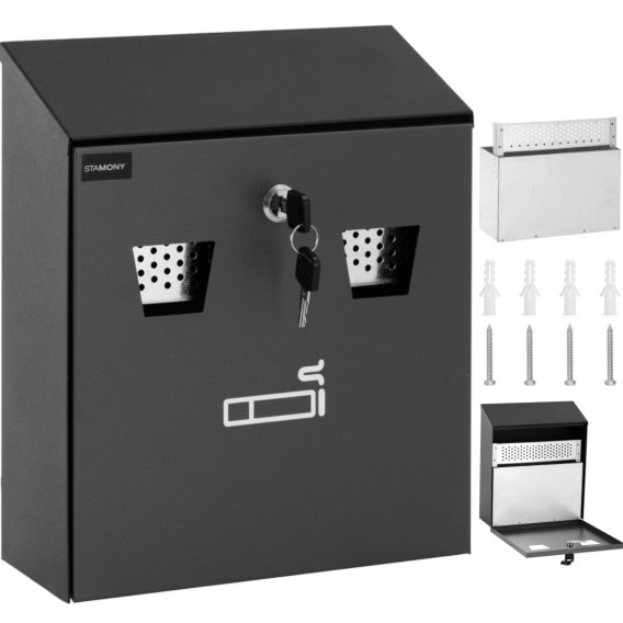 Popielniczka ścienna firmy STAMONY wykonana ze stali walcowanej na zimno nadaje się do użytkowania na zewnątrz. Dzięki proszkowym wykończeniem jest odporna na warunki atmosferyczne i rdzę. Jej duża pojemność zmniejsza częstotliwość opróżniania, a wyjmowany pojemnik zapewnia czystość i wygodę. Całkowity wymiar to 26 x 25 x 9 cm. Łatwa instalacje umożliwia dołączona szczegółowa instrukcja i akcesoria montażowe. Dodatkowo zabezpieczona zamkiem na klucz.