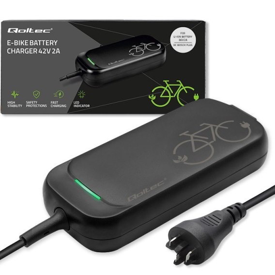 Qoltec Szybka Ładowarka Pro do roweru elektrycznego Bosch 36V | 42V | 2A | Bosch plug | wodoodporna +kabel zasilający
