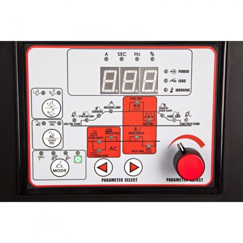 - - Wielofunkcyjność - Bezdotykowe zajarzanie łuku HF, Regulacja oraz czas opadania / narastania prądu, Wypływ gazu przed / po spawaniu (Gas Pre / Post-Flow Time), Prąd początkowy, końcowy, Puls, Wypełnienie impulsu, Balans prądu AC, 2T, 4T, Hot Start, Arc-Force, Anti Stick i inne.