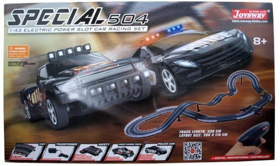 Kompletny zestaw do wyścigów Slot Cars od producenta Joysway. Zapewni on doskonałą zabawę dla dwóch zawodników którzy zmieżą się na tej trasie. Samochody poruszają się po specjalnie skonstruowanym do tego torze z prowadnicami.