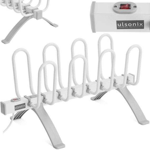 Elektryczna suszarka do butów marki Ulsonix pozwala na suszenie maksymalnie 4 par butów na 8 prętach grzewczych. Nośność wynosi do 30 kg. Wyważona konstrukcja sprawia, że urządzenie jest stabilne i nie przechyla się nawet przy maksymalnym obciążeniu. Przewód elektryczny ma długość 1,4 m. Cicha praca o głośności 8 dB jest niesłyszalna dla ludzkiego ucha. Elementy grzewcze o mocy 80 W szybko osiągają temperaturę do 55°C. Solidna aluminiowa konstrukcja zapewnia długą żywotność suszarki. Zabezpieczenie przed przegrzaniem zapewnia jej bezpieczne użytkowanie.