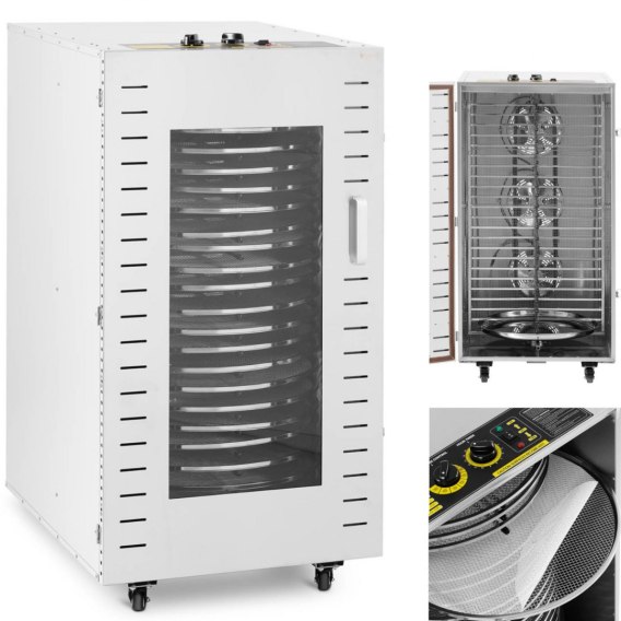 Suszarka do żywności marki Royal Catering umożliwia wysuszenie grzybów, warzyw, owoców a także mięsa czy ziół. Duża moc urządzenia 3070 W gwarantuje szybką i skuteczną pracę. Temperatura regulowana jest w zakresie 40-90°C. Timer umożliwia utrzymywanie jej w zakresie 0-15 h. Wnętrze urządzenia wyposażone zostało w 22 tace ze stali nierdzewnej oraz silikonowe maty idealne do suszenia soczystych owoców. Obudowę wykonano ze stali nierdzewnej. Drzwiczki posiadają okno z hartowanego szkła. Kółka z hamulcami umożliwiają wygodny transport.