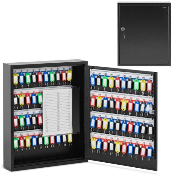Szafka zamykana jest na klucz (2 szt. w zestawie). Skrzynkę można zamocować do ściany za pomocą nawierconych otworów. W środku szafy można przechowywać maks. 80 kluczy. Szafka posiada 80 haczyków a w zestawie znajduje się 80 kolorowych zawieszek oraz papierowe listy do spisania zawartości. Szafka została wykonana z blachy o grubości 0,7 mm i została pokryta matową czarna farbą.