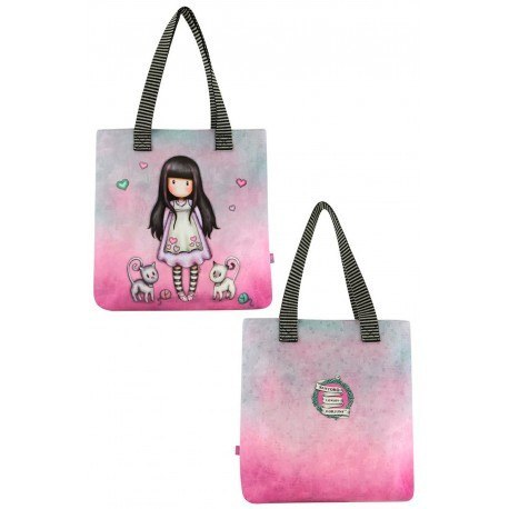 Torba Na Zakupy - Gorjuss -Tall Tails Piękna, torba na zakupy, która doskonale sprawdza się jako codzienna ozdobna torba na ramię. Pozwoli Ci wyglądać niezwykle stylowo. Przód ozdobiony wizerunkiem dziewczynki Gorjuss. Całość utrzymana w pięknym różowo - miętowym kolorze. Tył jednolity z ozdobnym logiem Santoro. Wnętrze wyściełane śliską podszewką w w drobne groszki. Wnętrze elegancko z wykończonym brzegiem z eko-skóry. Dodatkowo wewnątrz kieszonka na suwak. Posiada dwa solidne czarno - białe paski na ramię. Zapięcie na wygodny magnes. Wymiary: 2 cm x 39,5 cm x 35, 5 cm. Czyścić wilgotną ściereczką. Trzymać z dala od ognia.