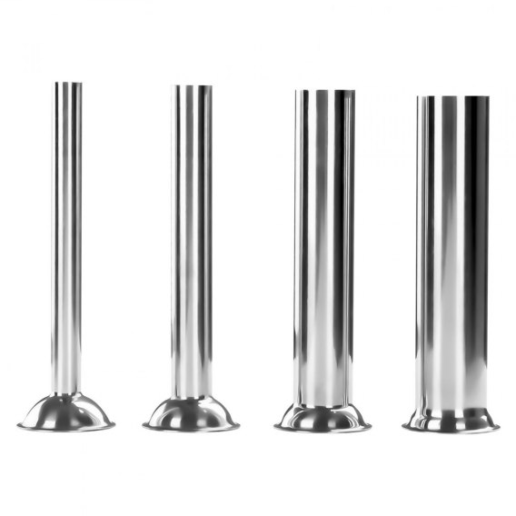 Komplet 4 lejków do nadziewarek o średnicy 16, 22, 32 i 38 mm oraz długości 180 mm każdy. Można dzięki nim przygotować kiełbasy o różnej grubości. Elementy wykonano z solidnej stali nierdzewnej, która zapewnia bardzo łatwe utrzymanie higienicznej czystości oraz komfort pracy. Kołnierz mocujący ma średnicę zewnętrzną 53 mm.