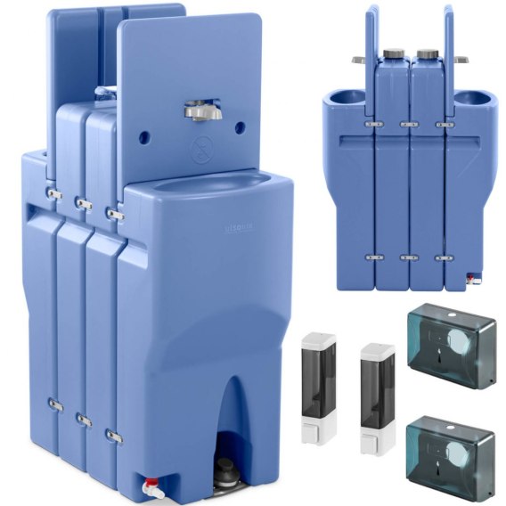 Podwójna umywalka posiada zbiornik na czystą wodę o pojemności 130 l oraz zbiornik na ścieki o pojemności 65 l. Umożliwia to korzystanie z urządzenia bez stałego dostępu do połączenia dopływów i odpływów. Jednocześnie odpowiednie przyłącza do zbiorników wody są dołączone do zakresu dostawy i sprawdzają się w razie potrzeby uzupełnienia wody lub spuszczenia ścieków. Bateria obsługiwana jest za pomocą pedałów nożnych, co jest bardzo wygodne i wyjątkowo higieniczne. Zintegrowane dozowniki mydła o pojemności 200 ml oraz uchwyty na papier zapewniają wysoki standard higieny. Korki do odpływu zabezpieczane są stalowym łańcuchem, dzięki czemu nie gubią się. Umywalka wykonana została z wytrzymałego tworzywa sztucznego.