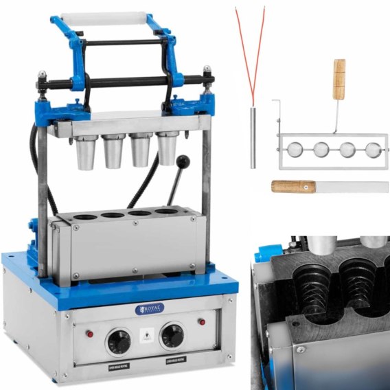 Waflownica marki Royal Catering dzięki swojej mocy 2400 W pozwala wytworzyć 100-120 wafli / godzinę. W zależności od tego jak chrupiące mają być rożki ich pieczenie zajmuje od 1 do 2 min. Wafle do lodów produkowane są w klasycznym stożkowym kształcie i mają wymiary 55 x 70 mm. Użytkowanie, czyszczenie i konserwacja maszyny do wafli przebiega łatwo i intuicyjnie. Dołączona miarka ułatwia tworzenie idealnych rożków lodowych. Urządzenie wykonane zostało z trwałych i odpornych materiałów takich jak stal nierdzewna, żeliwo, stal i aluminium.