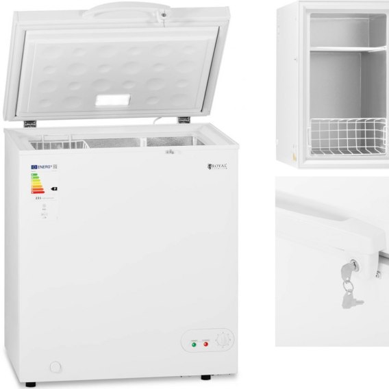 Zamrażarka skrzyniowa marki Royal Catering sprawdzi się do przechowywania żywności w restauracjach, bufetach, hotelach, sklepach a także w domowej spiżarni. Urządzenie posiada dużą pojemność 152 l. W komplecie znajduje siękosz i przegródka do segregacji żywności. Oświetlenie LED umożliwia lepszą widoczność wnętrza. Temperatura regulowana jest w 7 stopniach w zakresie -12 do -28°C. Wbudowanytermostat utrzymuje ją na wskazanym poziomie. Wnętrze wykonane zostało z tłoczonego aluminium, pomaga zachować niską temperaturę, jest estetyczne i łatwe w utrzymaniu czystości. Zawór spustowy umożliwia cykliczne rozmrażanie. Urządzenie posiada klasę energetyczną F, zastosowano w nim czynnik chłodniczy R600a. Obudowę wykonano ze stali malowanej proszkowo. Pokrywa zamykana jest na zamek, unosi się płynnie i zatrzymuje na dowolnej wysokości.