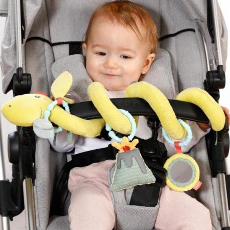 Zawieszka, Spirala Edukacyjna, Dinozaur z Kolekcji: Wesoły Dinozaur Kolorowa kolekcja Wesoły Dinozaur zabiera najmłodszych w podróż do czasów prehistorycznych. Na młodych poszukiwaczy przygód czeka wiele niesamowitych odkryć. Pluszowa Spirala Edukacyjna, to słodka maskotka, którą pokocha każde niemowlę. Z uroczym Dinozaurem dziecko ma zawsze wspaniałą zabawę obok. Dzięki dwóm podwójnym paskom, zawieszkę można szybko i łatwo przymocować do wózka, fotelika, czy łóżeczka. Maskotka jest pełna niespodzianek, które tylko czekają, by je odkryć. Na młodego zdobywcę nowych doświadczeń czeka lusterko, gryzaczek, grzechotka i piszczałka. Kolorowe oraz wyjątkowo przyjemne dla skóry dziecka materiały, z których maskotka została wykonana, są atrakcyjne dla maluszka, przyciągają jego uwagę, zachęcają go do obserwowania, dotykania i przytulania, ćwiczą świadome chwytanie. Przepiękne barwy zabawki i różnorodne faktury materiału, z których została wykonana, wzbudzą ciekawość i zapewnią mnóstwo radości w trakcie zabawy. To idealna maskotka dla najmłodszych. Z pewnością szybko stanie się wiernym towarzyszem dziecka w domu i w podróży, zawsze zapewniając dobry nastrój! Funkcje: Edukacyjna Maskotka, zachęca do zabawy, rozwija koncentrację, pozytywnie wpływa na rozwój sensoryczny. Rozwija zdolności motoryczne i koordynację ręka - oko. Grzechotka i piszczałka, wprowadza stymulację akustyczną. Bezpieczne lusterko inspiruje do samopoznania. Gryzaczek przynosi ulgę przy ząbkowaniu. Szczegółowe informacje o produkcie: Mięciutka maskotka z grzechotką, lusterkiem, gryzakiem, piszczałką. Łatwe mocowanie do wózka, łóżeczka, czy fotelika dziecięcego - dzięki dwóm podwójnym paskom. Materiał wierzchni: sztruks, aksamit, tkanina drukowana, muślin. Wypełnienie: 100% poliester. Prać ręcznie w 30C. Wymiary produktu: 35 cm x 18 cm x 8 cm. Wymiary opakowania: 23 cm x 32 cm x 9 cm. Wszystkie zabawki niemieckiej marki FEHN są bezpieczne dla dzieci od 0 lat. Wykonane są z najlepszej jakości materiałów. Spełniają normy EN71, CE. Są testowane pod kątem bezpieczeństwa przez niezależne instytuty badawcze. FE51186