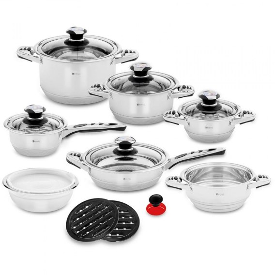 Zestaw garnków Royal Catering składa się z 16 elementów, wśród nich znajdują się m.in. patelnia i garnek do gotowania na parze. Model RCST-16PI nadaje się do użytku na wszystkich rodzajach kuchenek oraz płyt. Każdą część kompletu wykonano z solidnej i prostej do umycia stali nierdzewnej. Wydajną pracę zapewniają 7-warstwowe dno garnków (efektywne rozchodzenie się ciepła), a także przezroczyste pokrywki ze szkła hartowanego. Uchwyty pokrywek z termometrem gwarantują wygodną kontrolę temperatury. Napełnianie naczyń ułatwia znajdująca się w środku podziałka.