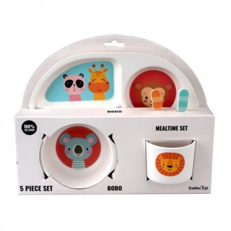 Zestaw Naczyń Dziecięcych z Melaminy, 5 el., Bobo Zestaw Naczyń Dziecięcych z Melaminy, 5 el., BoboUroczy zestaw obiadowy z melaminy z wizerunkami wesołych zwierząt sprawi, że każdy posiłek będzie dużo przyjemniejszy dla dzieci. Zestaw składa się z 4-komorowego talerzyka, miski, kubka oraz łyżeczki i widelca. Ten zestaw do jedzenia to idealny początek, gdy maluch musi zacząć samodzielnie jeść. Zestaw do jadalni wykonany jest z żywicy melaminowej (bez BPA), która jest zarówno praktyczna, trwała, jak i absolutnie niezbędna do codziennego użytku. Dzieciom spodoba się posiadanie własnego zestawu do jedzenia ozdobionego uroczymi zwierzątkami. Doskonały pomysł na prezent na chrzciny, imieniny, urodziny.Szczegółowe informacje o produkcie:W zestawie: 4 - komorowy talerz, miseczka, kubek, łyżeczka i widelec.Nie zawiera BPA.Naczynia z melaminy przede wszystkim są ekologiczne, odporne na uszkodzenia, nie tłuką się, są wytrzymałe na uderzenia.Przeszły wszystkie rygorystyczne badania związane z dopuszczeniem ich do użytku dla dzieci. Są bez BPA, bez ftalanów, wyprodukowane zgodnie z obowiązującymi, europejskimi normami bezpieczeństwa.Można myć w zmywarce.Kategoria wiekowa: 1+.Wymiary opakowania: 30 cm x 25 cm x 5 cm.Uwaga: Umyć przed pierwszym użyciem, nie używać w kuchence mikrofalowej.Uwaga: Bambusowe produkty melaminowe można stosować do ciepłych posiłków (do 70 stopni Celsjusza).Produkty Barbo Toys są projektowane w Danii, ze szczególną dbałością o zrównoważony rozwój i wysokiej jakości materiały. Zabawki są wytwarzane zgodnie z filozofią "nauka przez zabawę", aktywnie wspierają i stymulują zarówno wyobraźnię jak i edukację dziecka, przy tym charakteryzują się doskonałym skandynawskim wzornictwem. BAR5323
