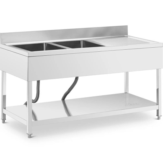 Zlew marki Royal Catering to idealne rozwiązanie do kuchni komercyjnych, restauracji i podobnych obiektów, a także laboratoriów. Kompaktowy stół gastronomiczny ma dwa wyjątkowo pojemne zlewy, w których z łatwością można pomieścić duże i nieporęczne garnki, patelnie lub ruszty grillowe. Obok umywalek o wymiarach 400 x 500 x 250 mm każda znajduje się ociekacz do suszenia umytych naczynia. Ponadto praktyczny rant o wysokości 120 mm chroni . Zlew gastronomiczny wykonany jest w całości z wytrzymałej stali nierdzewnej. Jest trwały, odporny na korozję i zachowuje swój połysk przez długi czas. Dzięki ponadczasowemu wzornictwu pasuje do każdej kuchni. Sprzęty ze stali nierdzewnej są również szybkie i łatwe w czyszczeniu. Nóżki są regulowane aby zachować stabilność nawet na nierównej podłodze.